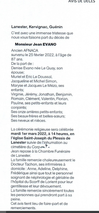 Décédé à Lorient (56100, France) le vendredi 25 février 2022 à l'âge de 87 ans