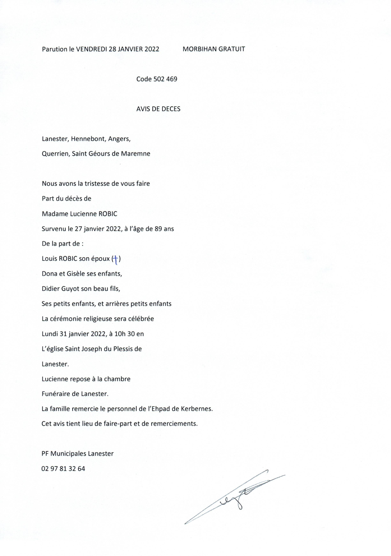 Décédée à Ploemeur (56270, France) le jeudi 27 janvier 2022 à l'âge de 89 ans